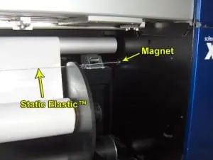 Getting off the static before printing requires careful placement of the StaticElastic™ – see placement below. The StaticElastic™ is placed across the substrate before it enters the printer. The magnet provides grounding to the machine.