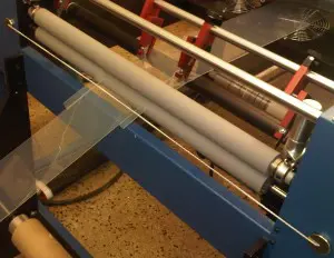 High static on laminating machines causes dust defects and shocks to operators. The StaticElastic™ is placed as shown to eliminate the defects and shocks. Call us if you need help – static shocks can get complicated.