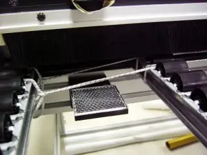 The StaticElastic is placed across the conveyer, under the media, and grounded to the metal of the machine as shown above. The static is removed from both sides of the substrate.